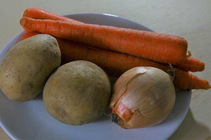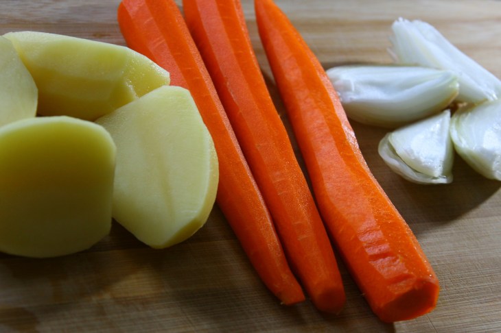 Éplucher les carottes et les pommes de terre. Rincer à l’eau.