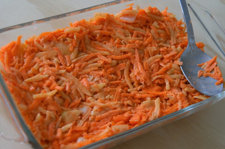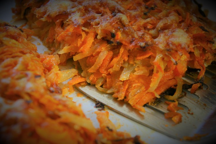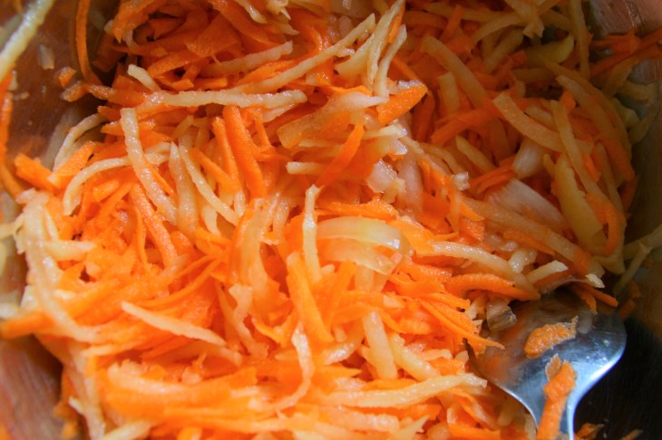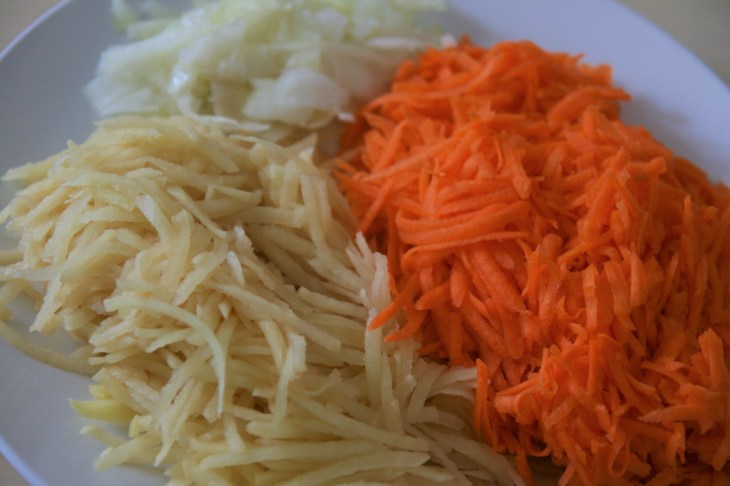 Râper l’oignon, les carottes et les pommes de terre, puis les mélanger dans un saladier.