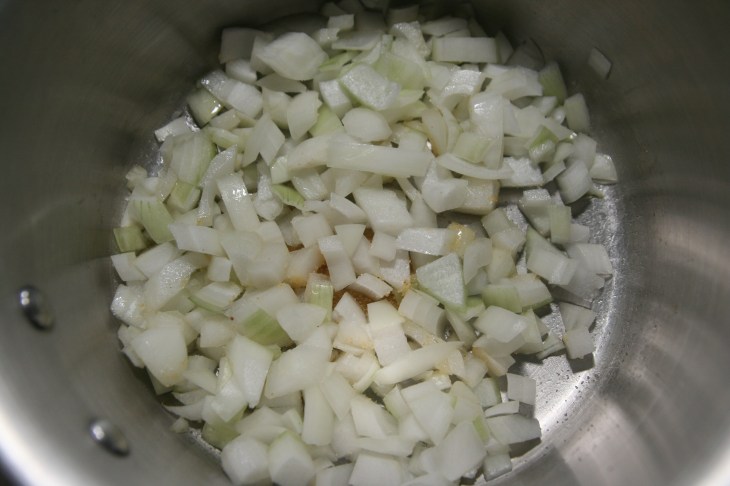 In a large saucepan, heat the oil and fry the onion and garlic for 2 minutes.