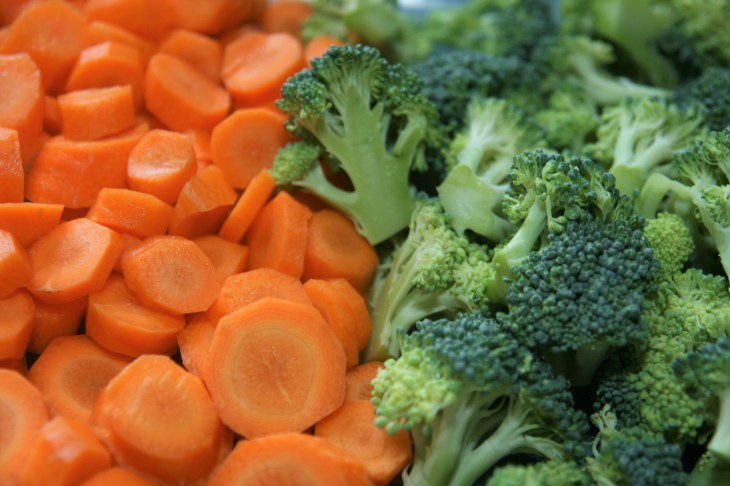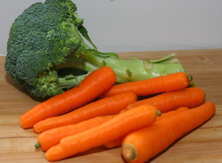 In a baking dish, mix the pieces of broccoli and carrots with the olive oil.
