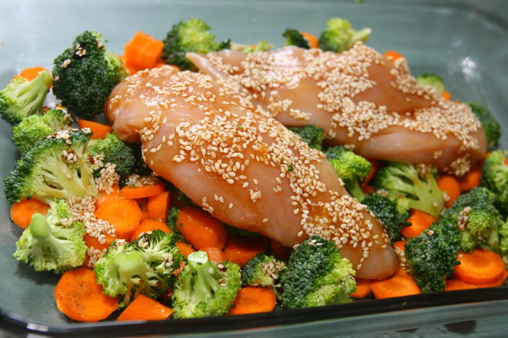 These chicken breasts simply baked on fresh vegetables, topped with a homemade Teriyaki sauce, are an all-in-one dinner that is ready in minutes!
