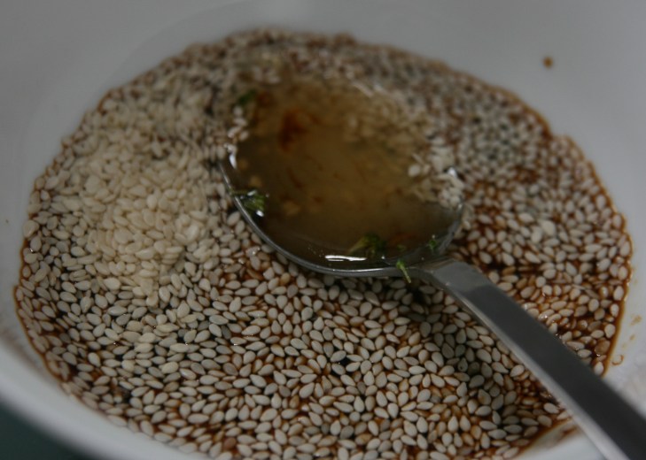 In a mixing bowl, mix all the ingredients of the sauce: water, soy sauce, honey, sugar and sesame seeds.