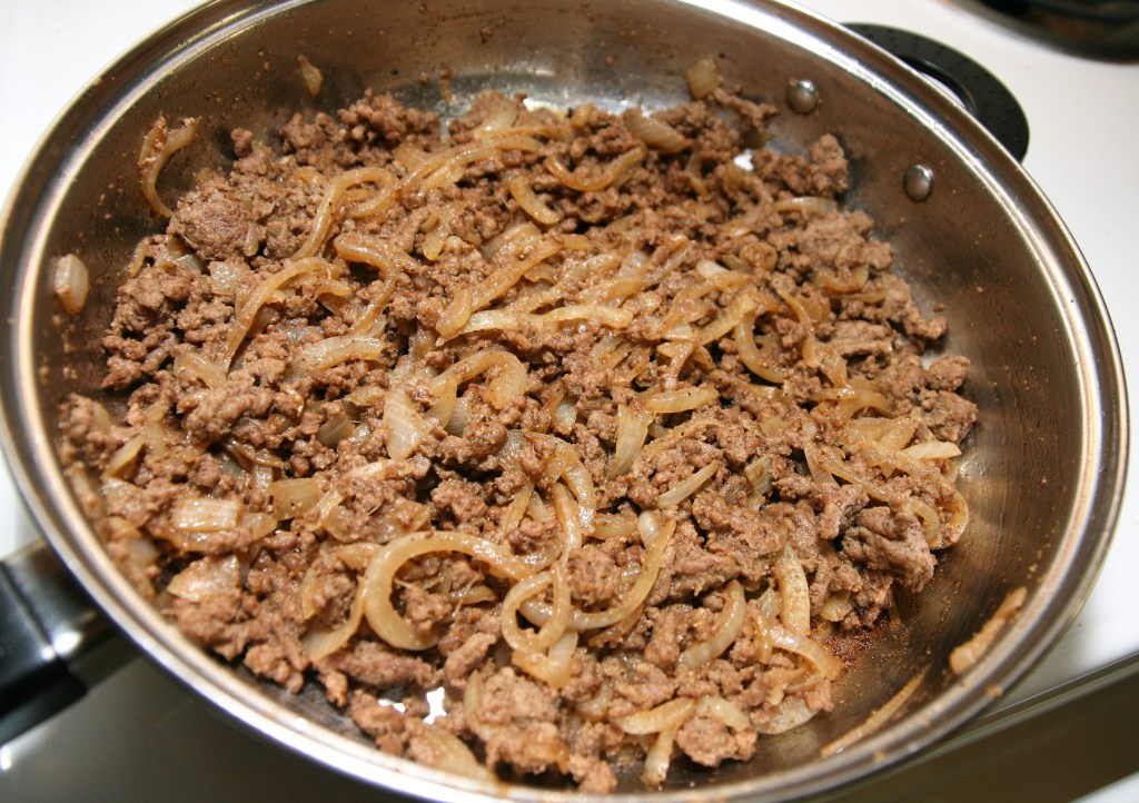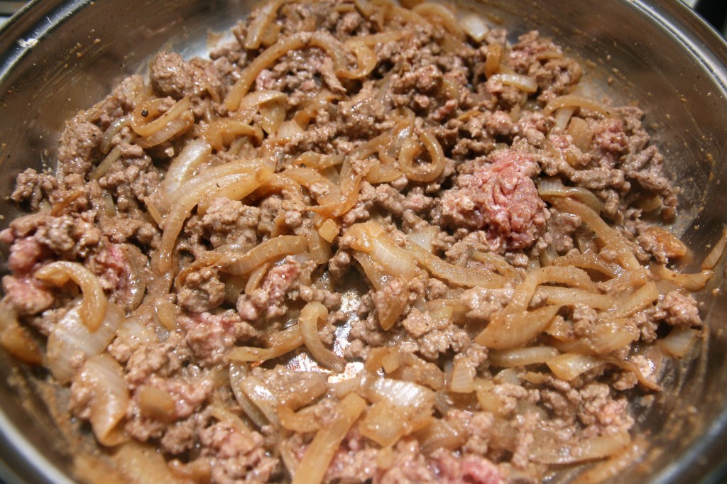 Lorsque les oignons sont bien attendris, ajouter le bœuf haché. Emietter le bœuf dans la casserole et mélanger avec les oignons. Poursuivre la cuisson à feu moyen (5/10) pendant la préparation du chou.