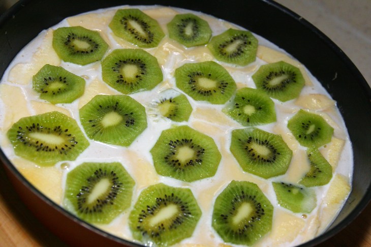 Gently put the kiwi slices on your preparation in the mold.
