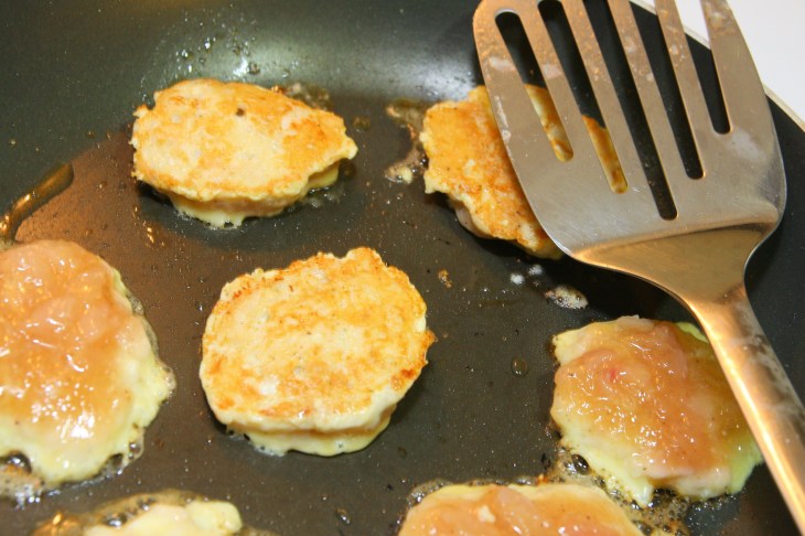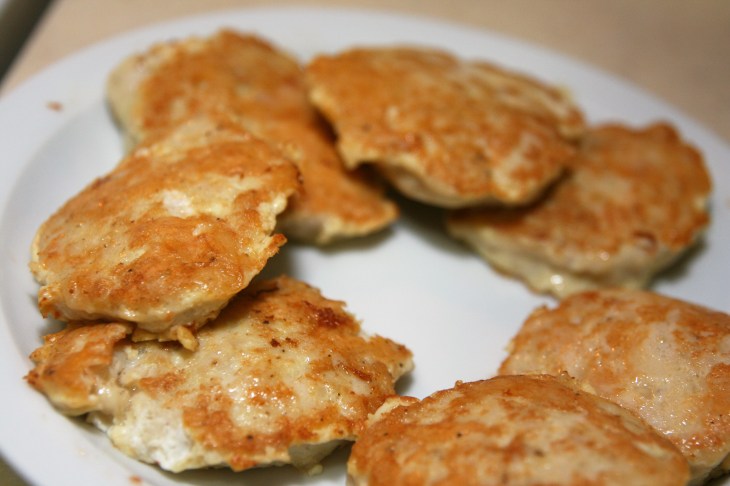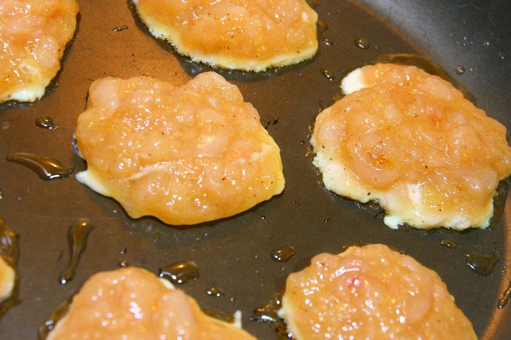 Dans une poêle, faire chauffer l’huile de tournesol. Lorsque l’huile est chaude : prendre une cuillère à café bien pleine de mixture au poulet et la déposer dans la poêle, puis écraser légèrement avec le dos de la cuillère pour former un steak. Répéter la même opération avec le reste de la mixture pour obtenir 6 à 8 steaks.