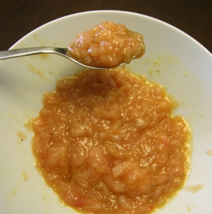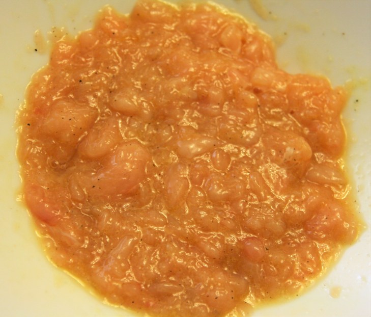 Dans un saladier, mélanger le poulet haché, l’œuf, l’oignon en poudre, le sel et le poivre.