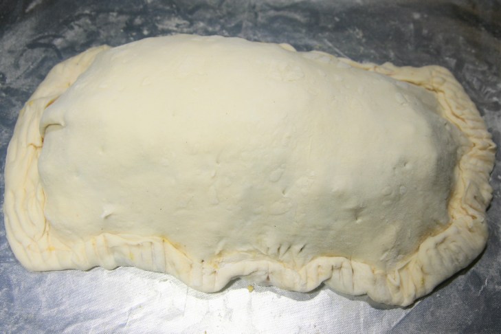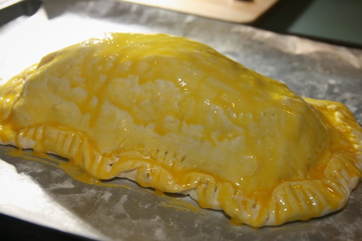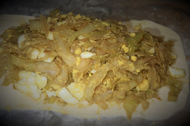 Déposer le mélange de chou et œufs sur la moitié de la pâte, puis recouvrir de l’autre moitié de la pâte. Presser les bords du feuilleté pour bien le fermer.