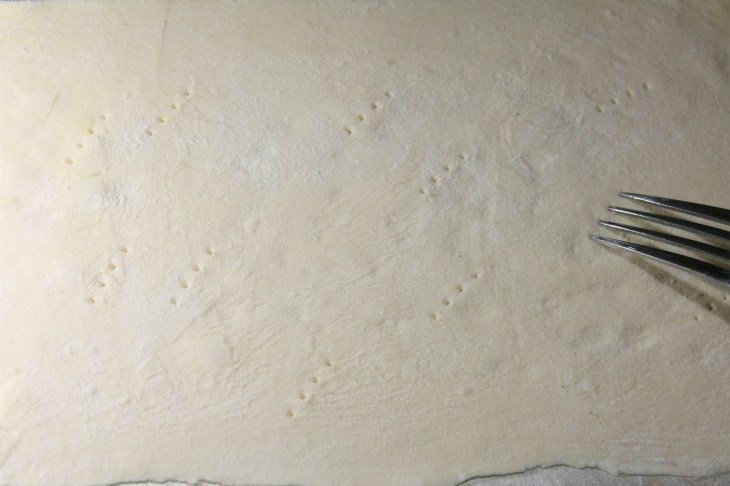 - Couper la pâre feuilletée en deux. Étaler la pâte feuilletée sur une plaque de cuisson recouverte d’un papier sulfurisé. Piquer la pâte à l’aide d’une fourchette.