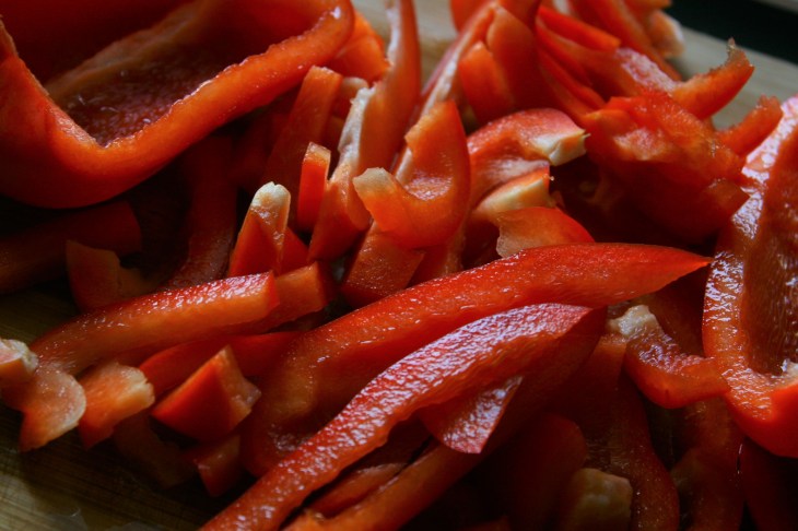 Couper les poivrons en lanières minces.