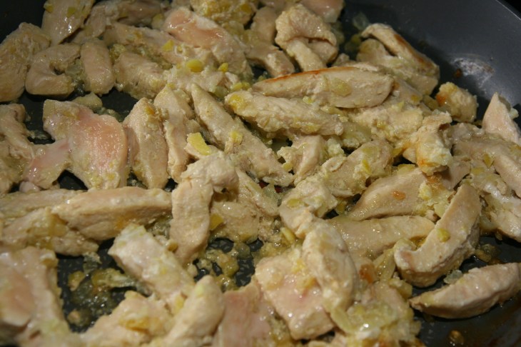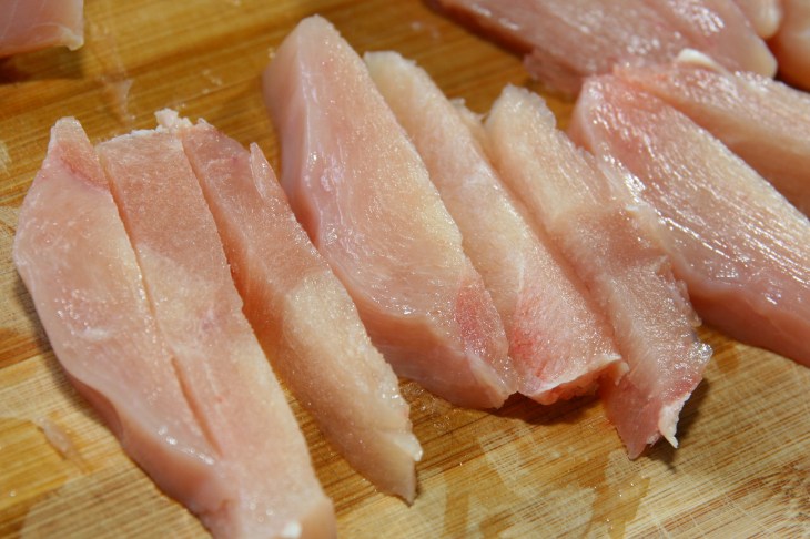 Couper le poulet en lanières minces.
