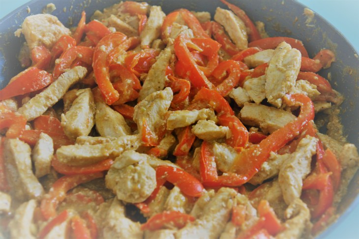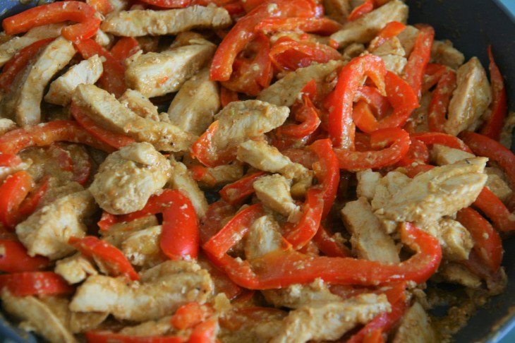 Cuire en remuant régulièrement jusqu’à ce que les poivrons soient tendres et que le poulet soit cuit, environ 15 minutes. Saler à votre goût les dernières minutes de cuisson.