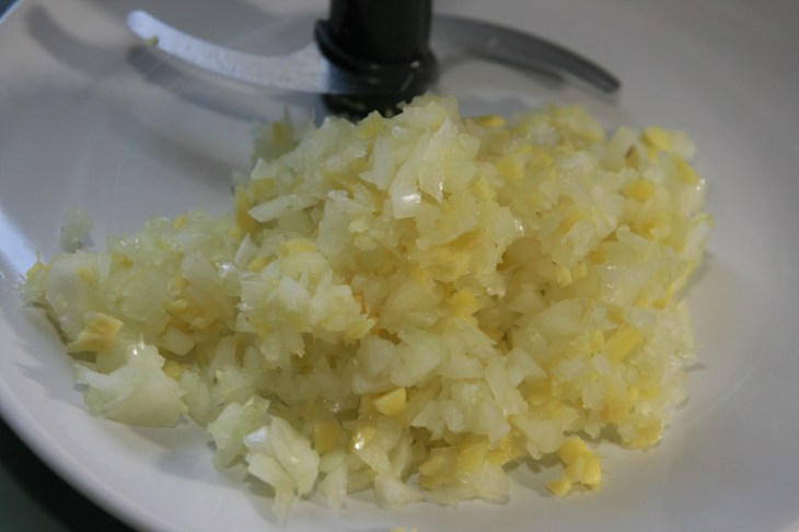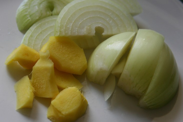 Peler l’oignon et le gingembre.