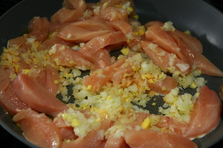 Chauffer l’huile dans une poêle ou un wok à feu élevé. Ajouter le poulet, l’oignon, l’ail et le gingembre. Cuire en remuant constamment jusqu’à ce que le poulet commmence à dorer, environ 5 minutes.