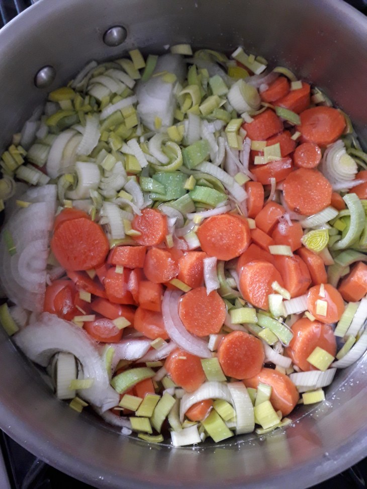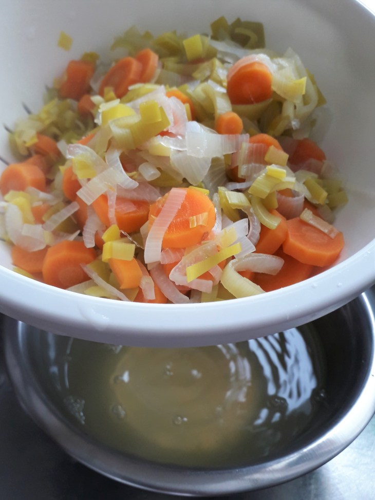 After 20 minutes of cooking, your vegetables are tender. Drain the vegetables, retaining the cooking water (vegetable broth).