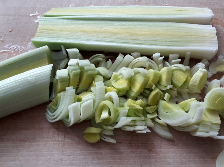 Leek: Remove the roots and the green part of the leeks. Wash the leek whites with water.