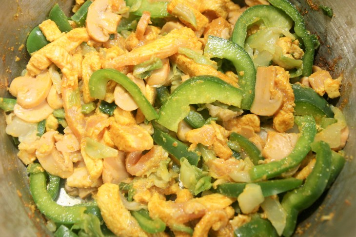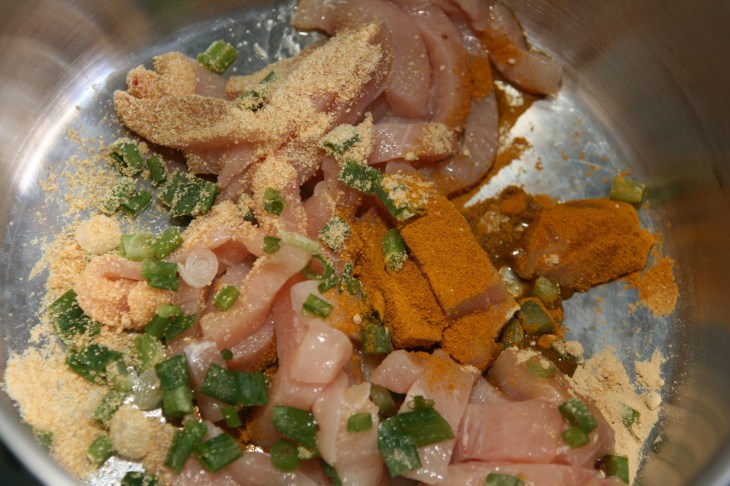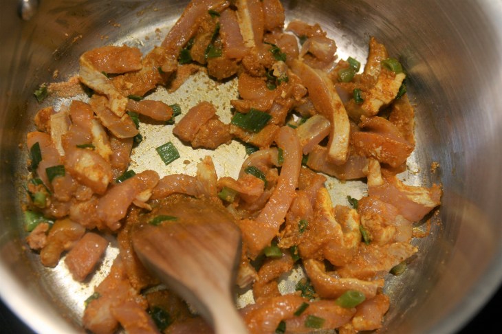 Dans une casserole, mélanger le poulet avec l’huile, l’oignon, l’ail, le gingembre et la poudre de cari. Faire revenir 2 minutes sur feu vif en remuant sans cesse.