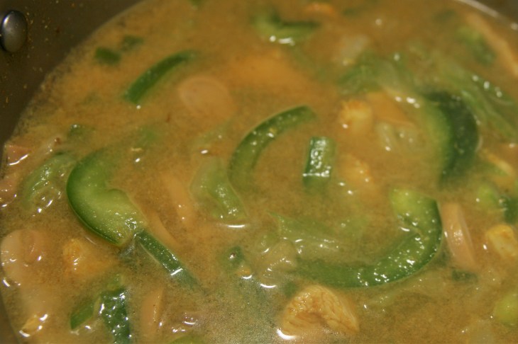 Lorsque les ingrédients commencent à accrocher à la casserole : ajouter le bouillon de poulet sur les ingrédients. Ajouter la sauce Sriracha et les feuilles de lime.