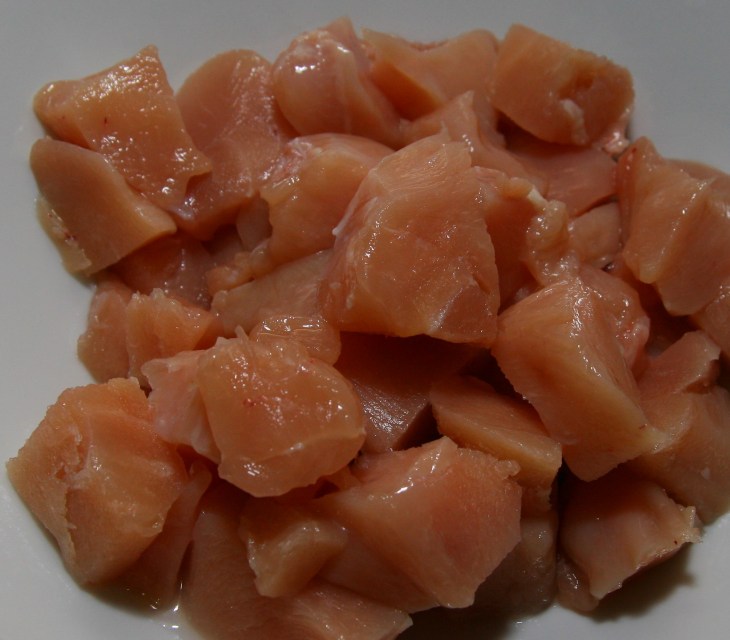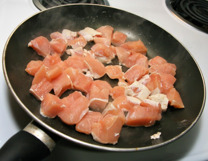 Heat the oil in a pan and fry the chicken. Turn back occasionally so that all chicken pieces are cooked.
