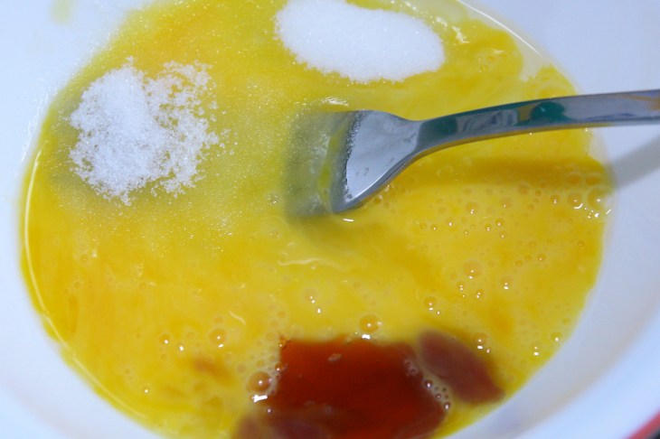 In a mixing bowl, beat the eggs into an omelette. Add the fine sugar, vanilla and milk. Mix to obtain a homogeneous mixture.