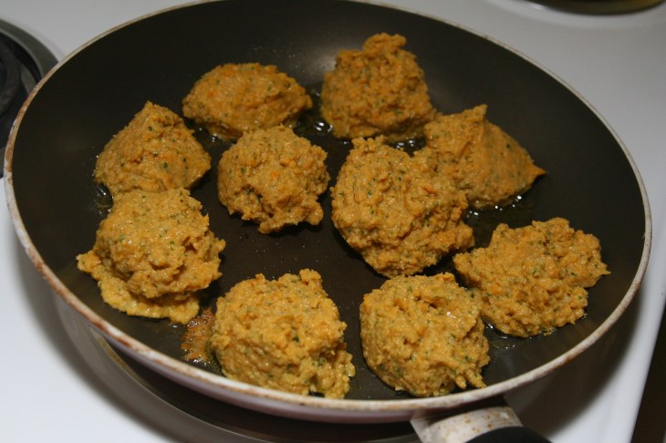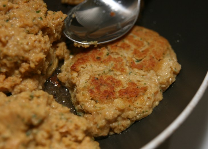 Sur feu moyen (5/10), faire chauffer l’huile dans une grande poêle. Puis, à l’aide d’une cuillère à soupe, y déposer des tas de pâte. Vous pourrez former de 8 à 10 galettes.