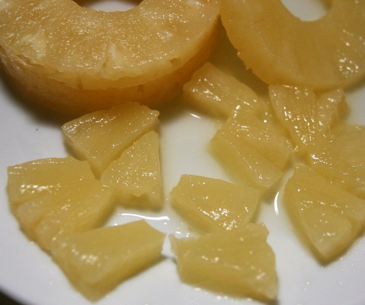 Peser 200 g d’ananas, puis découper en petits morceaux.