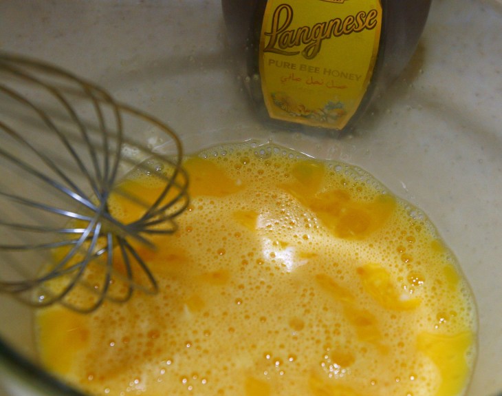 Casser les œufs dans un saladier. Ajouter le miel. Mélanger.