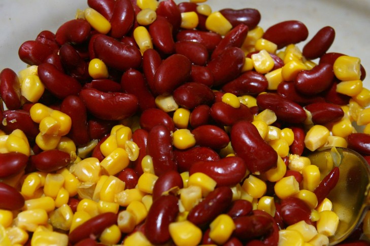 Dans un saladier, mélanger le maïs, les haricots rouges, l’oignon en poudre, les morceaux de poivron et de tomates.