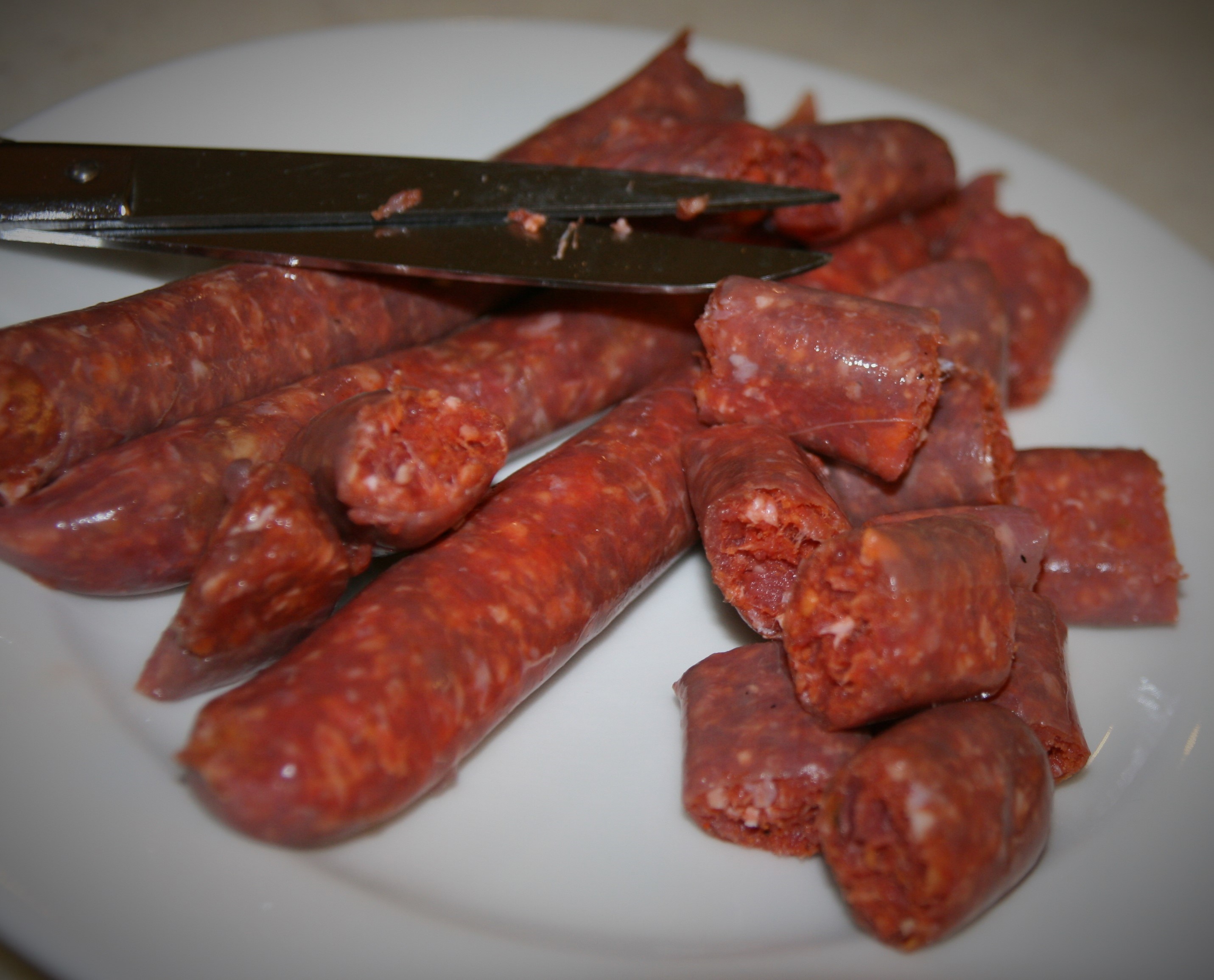 Pendant la cuisson des oignons : couper les merguez en morceaux à l’aide de ciseaux.