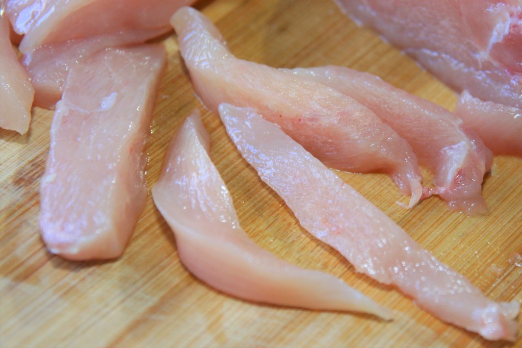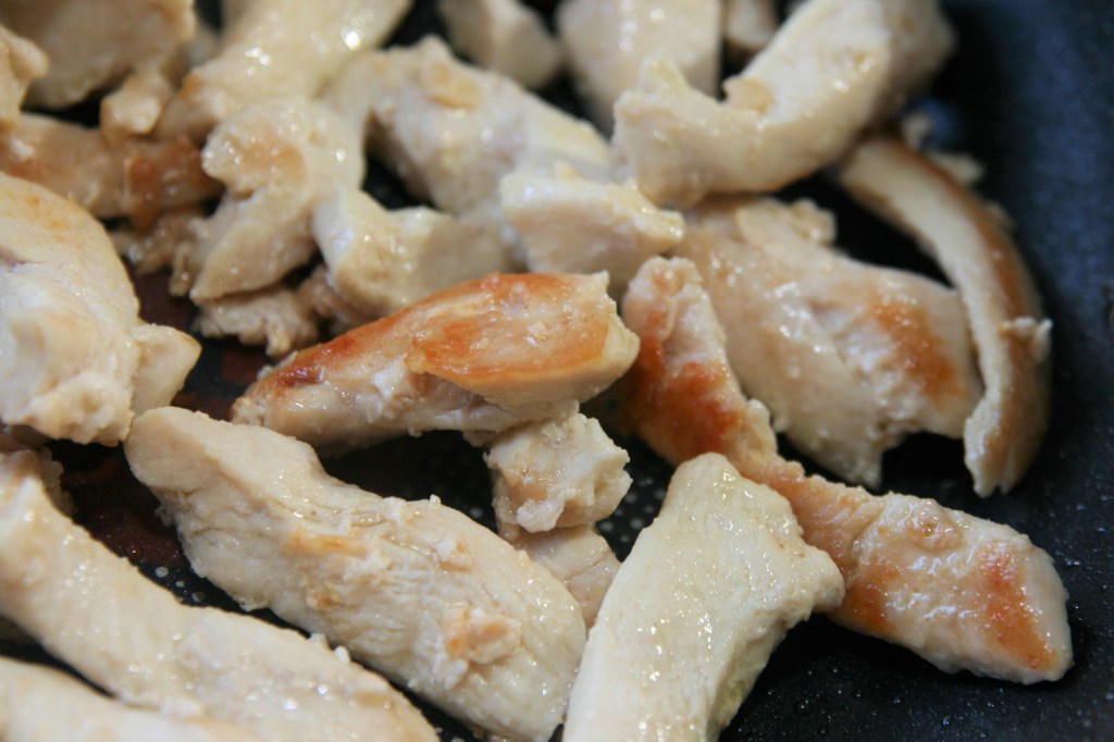 Dans une poêle, griller le poulet avec une cuillère à café d’huile.