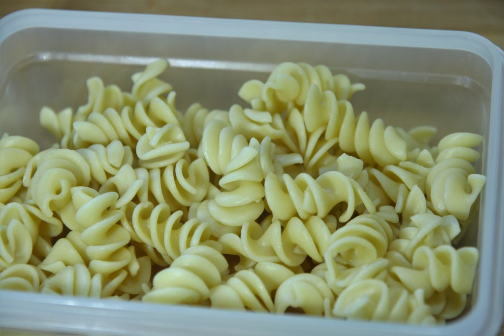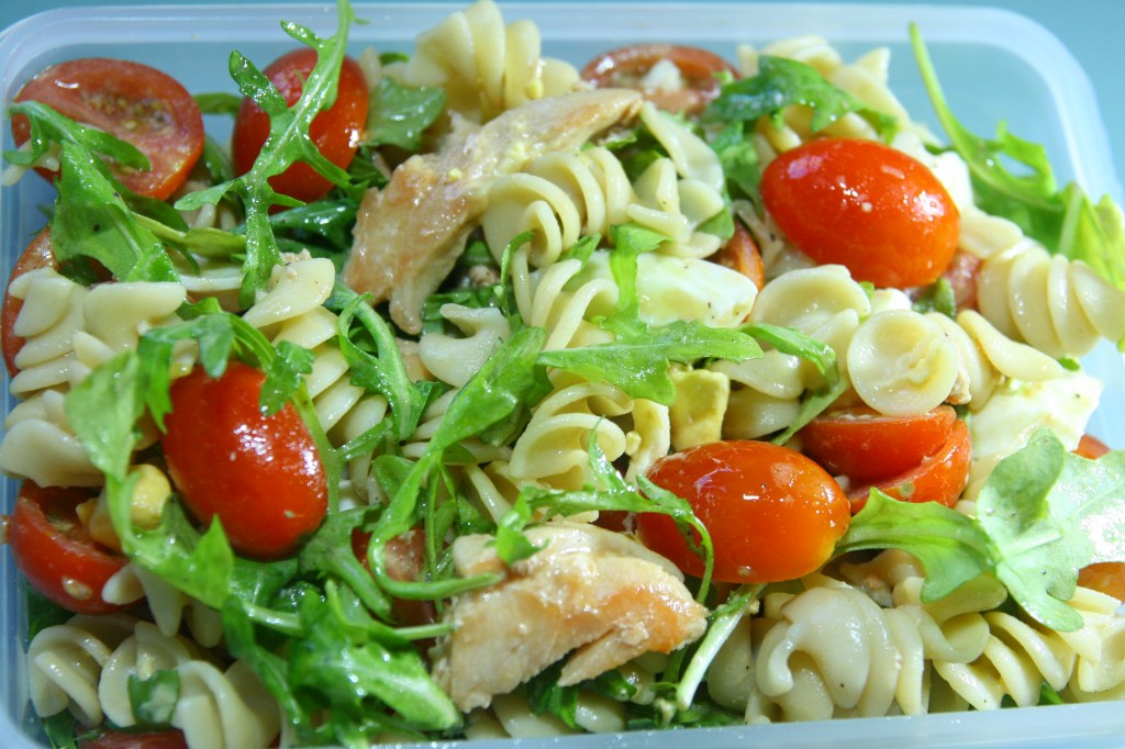 Dans un saladier, mélanger tous les ingrédients : pâtes cuites, lanières de poulet grillé, œuf, tomates et salade roquette. Mélanger.
