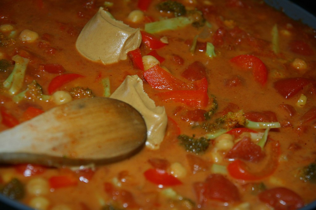 After 20 minutes of cooking, lower the heat (3/10). Add the coconut milk and peanut butter.