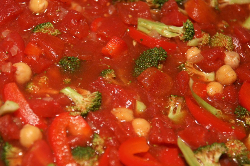 Add the diced tomatoes, drained chickpeas, pieces of broccoli and water.