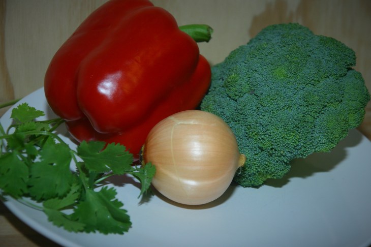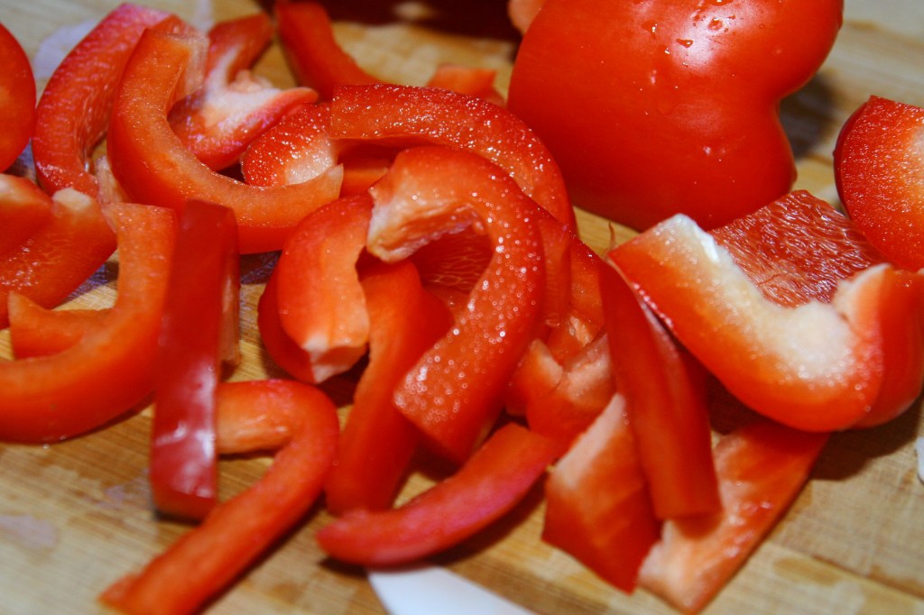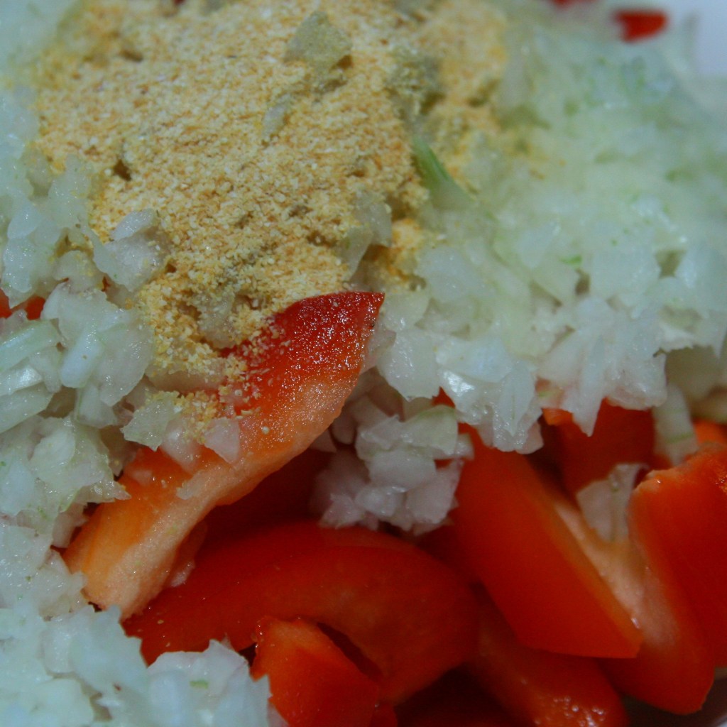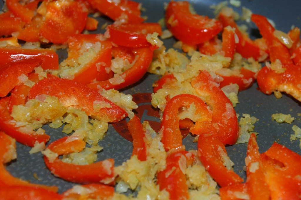 Heat the oil in a frying pan and brown the onion, bell pepper strips and garlic for about 5 minutes. Stir regularly.