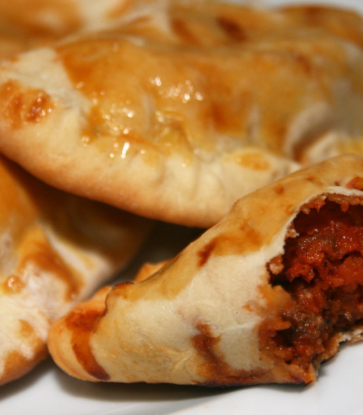 Pizza folded in half and filled with delicious ingredients: a thick sauce rich in vegetables accompanied by ground beef meat or cheese.