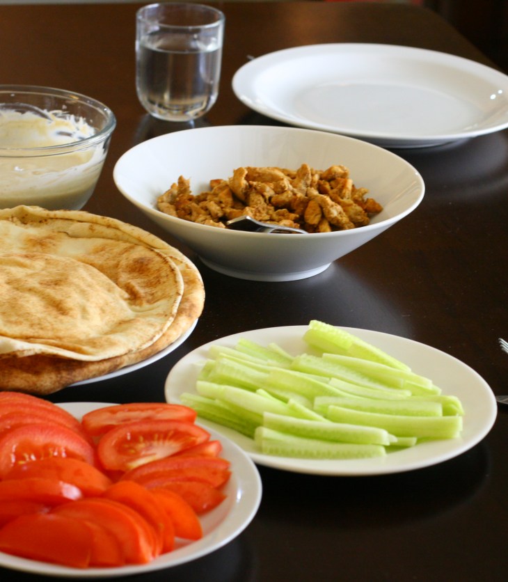 It’s a kind of Lebanese-style chicken kebab … pita bread topped with spicy marinated chicken, mixed with raw vegetables, seasoned with garlic and yoghurt sauce.