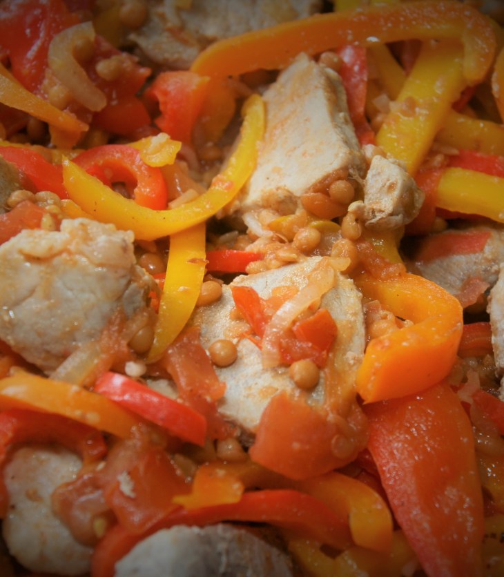 Simple, warm and filling lentil stew with grilled pork and vegetables