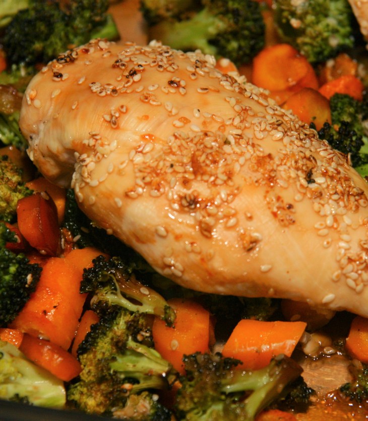 Ces blancs de poulet simplement cuits au four sur des légumes frais, nappés d’une sauce Teriyaki maison, constituent un dîner tout-en-un, prêt en quelques minutes !